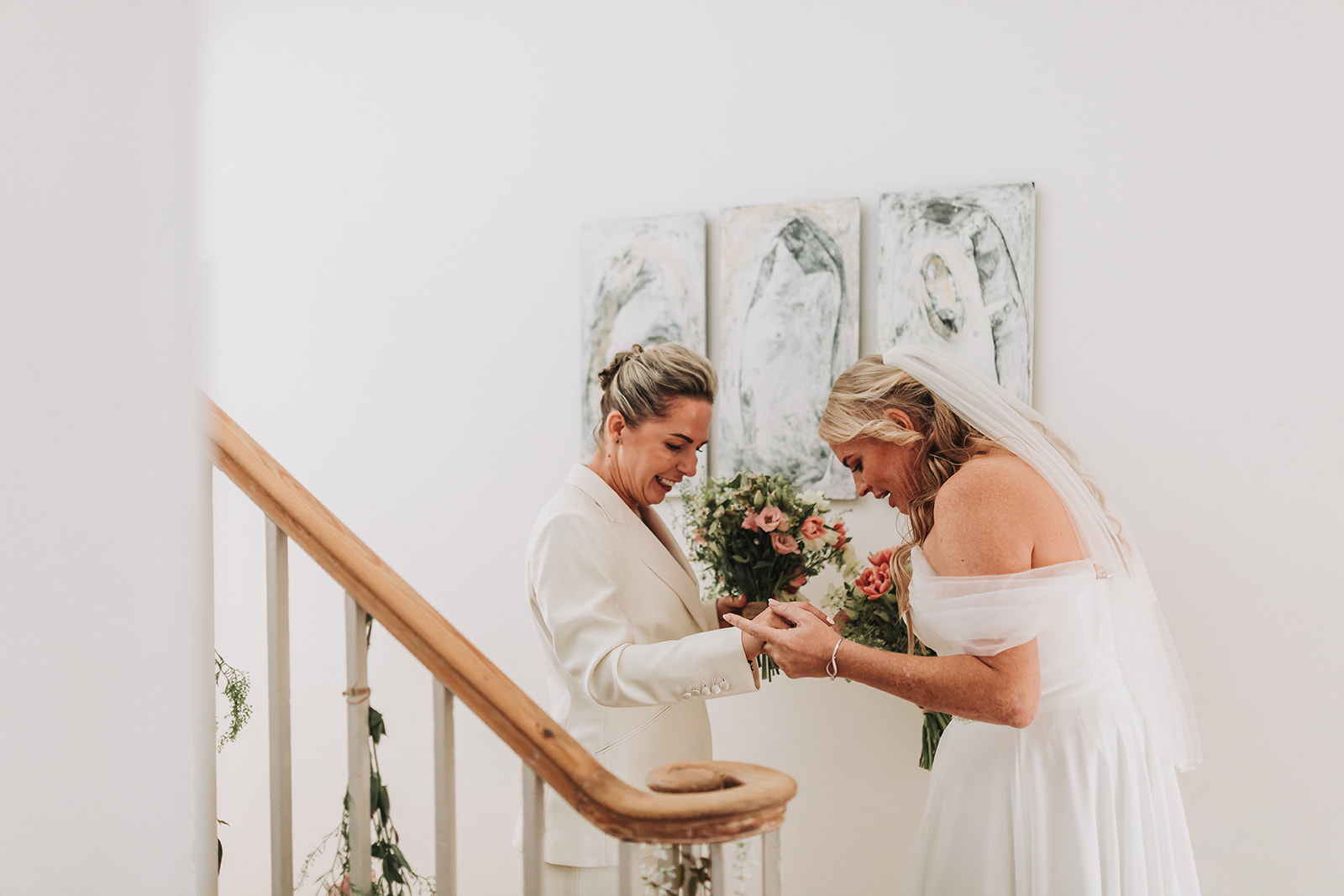 I will never forget the buzz of excitement on Kelly and Helen’s wedding morning – well actually from the moment the couple and their guests arrived the day before the wedding day! It was an all-female wedding party that stayed overnight at Treseren and the girls night out / slumber party atmosphere was contagious – I didn’t want to go home!! Kelly and Helen’s daughters became my right-hand women and together we made sure there were no accidental meetings before that magical moment at the bottom of the stairs when they saw each other for the first time ahead of the ceremony. They chose to walk down the aisle together, which was really special.